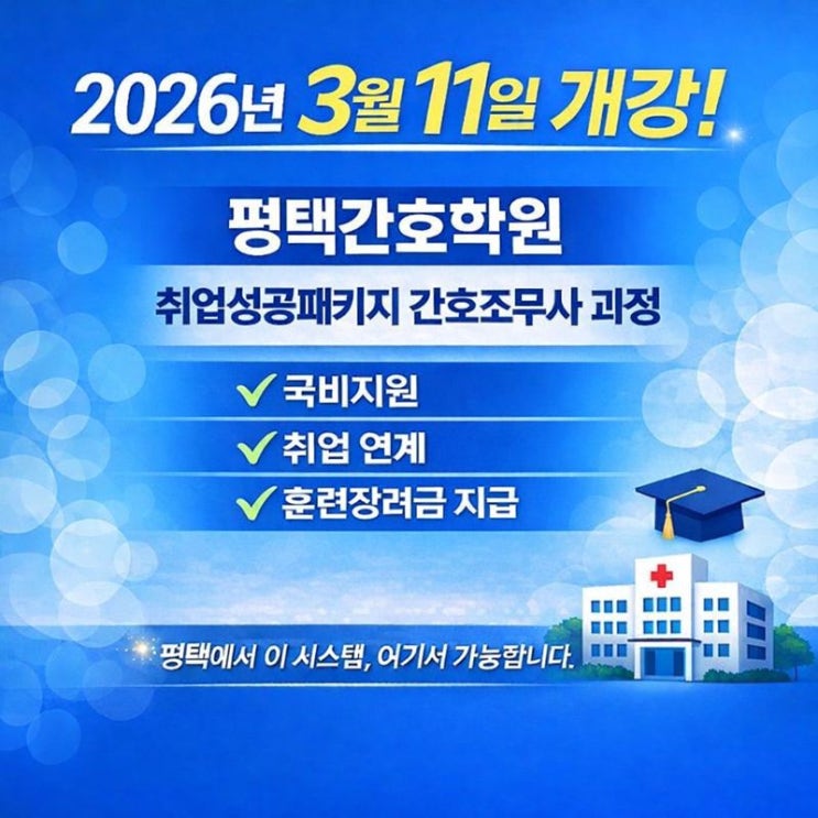 ✅ 2026년 3월 11일 개강! 평택간호학원 & 취업성공패키지 안내 “자격증 + 취업 + 생활비 지원까지 한 번에”취업성공패키지를 제대로 운영하는 간호학원, 바로 평택간호학원입니다. 한눈에 보는 핵심 요약 왜 ‘취업성공패키지’는 평택간호학원인가? 많은 분들이 “취업성공패키지 아무 학원에서나 다 똑같은 거 아니에요?” 라고 묻습니다. 하지만 실제로 해보면 차이가 확실합니다. 평택간호학원은 ‘훈련만 하는 학원’이 아니라, ‘취업까지 책임지는 학원’입니다. ✔ 평택간호학원만의 취업성공패키지 운영 강점 고용센터와 실시간 취업 연계 네트워크 지역 병원·요양기관 직접 채용 연계 1:1 취업 상담 + 이력서 + ....... <img src="https://blogthumb.pstatic.net/MjAyNjAxMjRfMjIy/MDAxNzY5MjI4MDE3ODMz.FQNnCqgu8vTVAvFbnkTcs9y0j9C25CCM9PXJ9MmJnaIg.mFPRFSarJpE9I9NVKUEKX1kARglzOyC22kHY5gh3TYQg.JPEG/1-1.jpg?type=s3" />