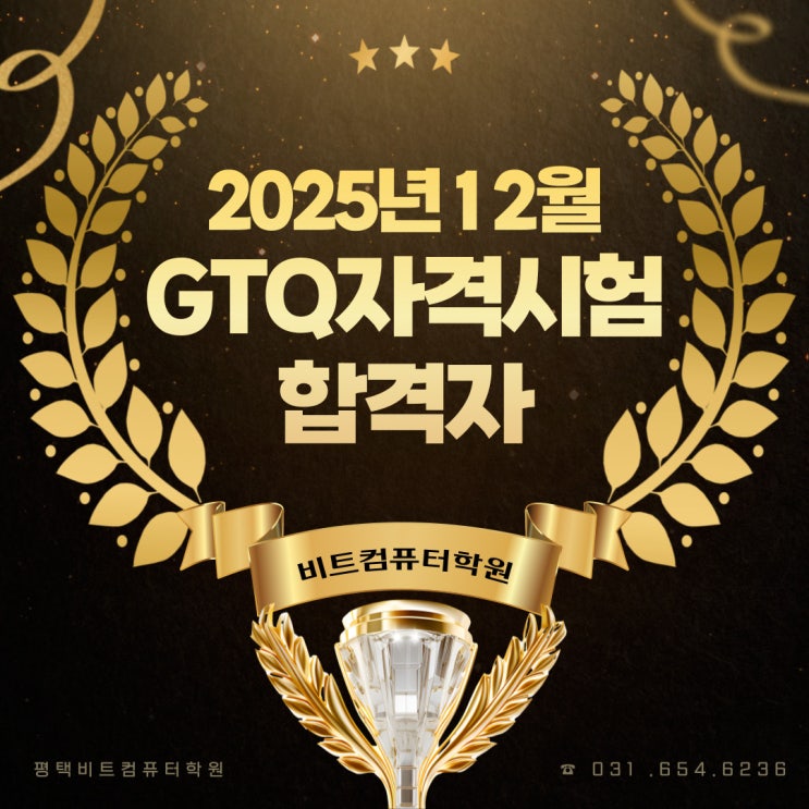 안녕하세요! 컴퓨터디자인전문교육 비트컴퓨터학원입니다 오늘은 비트컴퓨터학원 2025년 12월 GTQ 자격시험 합격자 소식을 들고 왔습니다!! 시험 합격을 진심으로 축하드립니다 평택 비트컴퓨터학원에서는 GTQ(포토샵) GTQi(일러스트) 컴퓨터그래픽기능사 웹디자인개발기능사 모두 취득이 가능합니다!! 이 모든 수업들이 항시 개강되어있으니 컴퓨터디자인수업을 배우고 싶으시면 비트컴퓨터학원을 찾아주세요 컴퓨터디자인관련 문의는 방문 상담 & 전화 상담해 주시면 친절한 상담 도와드리겠습니다 평택비트컴퓨터학원 031 - 654 - 6236 평택시 비전5로 11 타임빌딩 7층 (지엔산부인과 옆 비전문고 건물 7층....... <img src="https://blogthumb.pstatic.net/MjAyNjAxMjZfMjMy/MDAxNzY5NDEzNjg1ODI0.MC2VrpJb-aDRNQQ-M8SgDz6TmXJgc5YncDnNmAlr_HMg.E6YYZg2_lcw11xzIZqN7HzRBoq6oNq_7hmLJ0TO7H-wg.JPEG/003.jpg?type=s3" />