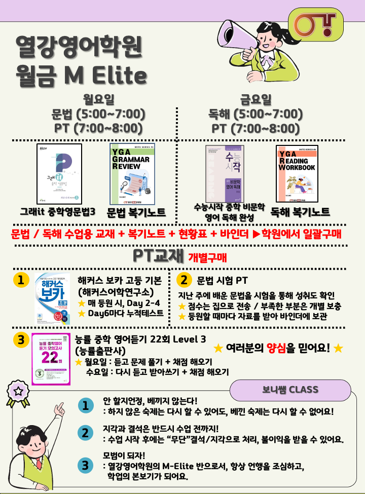 새로 시작한 고덕관, M Elite 반이 생각보다 빠르게 자리를 잡고 있어요 고덕관을 새로 열면서 사실 가장 신경 썼던 건 “얼마나 빨리 채울 수 있을까”가 아니라 ‘최대한 빨리 제대로 굴러가는 반’을 만어야한다!‘였어요. 개강 후 3주가 지난 지금 “아, M Elite 반은 방향이 잘 잡혔다”라고 느껴져서 소개드립니다! M Elite 반은 중1 상위권~중2 중위권~중3 하위권 학생들이 수강하기에 딱! 알맞은 반이에요~ 모든 아이들이 같은 출발선은 아니지만, 같은 목표를 향해 갈 수 있도록 레벨을 설계한 반이에요. 목표는 명확합니다 중3 수준 문법을 끝까지 마스터하는 것. 너무 쉬워서 늘어지지도, 너무 어려워서 따라오기 힘들지도 않게 개념....... <img src="https://blogthumb.pstatic.net/MjAyNjAxMjNfNjQg/MDAxNzY5MTc3MzgwOTgx.uOU2Ng4HBZQ44j-VRHP_oyPOCSXuuazGs-iw1VMwpCsg.gIt3CflGvp8hwlBY1bo67a6imcGW3DurdlX7mMhBRlAg.PNG/2026_%BC%F6%BE%F7%BE%C8%B3%BB%B9%AE_%C7%D5%BA%BB.png?type=s3" />