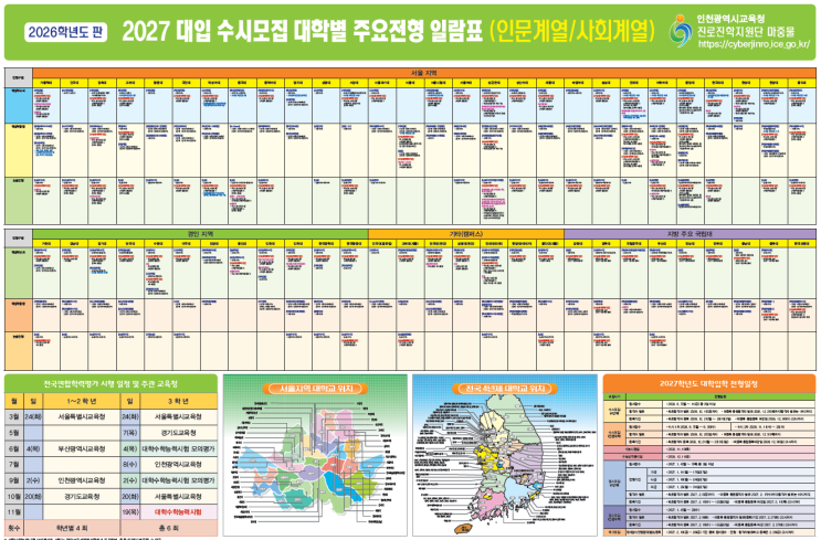 안녕하세요. 푸른국어학원입니다. 오늘은 인천광역시 교육청 진로진학 지원단에서 배포한 2027학년도 대입 수시 모집 대학별 주요 전형 일람표를 공유해드립니다. 변화하는 입시환경에서 계열별 맞춤 전략을 세우는데 필수적인 자료이니, 꼭 확인해보세요. # 계열별 주요전형 일람표 활용법 인문사회계열 : 학생부 종합 및 교과 전형에서의 최저학력기준 변화 확인. 자연공학계열 : 필수 응시 과목 ( 미적분/기하, 과탐) 지정 여부 및 가산점 확인. Tip: 도표를 보실 때 희망 대학의 전형 방식이 전년도와 어떻게 달라졌는지 비교해 보는 것이 중요합니다. # 자료를 보시다가 우리 아이에게 맞는 전형이 무엇인지, 현재 성적으로 어느 대학 지원....... <img src="https://blogthumb.pstatic.net/MjAyNjAyMjRfMTc3/MDAxNzcxOTMyMjgxMDAx.oRR2hpea5_7qR6insYtoC5aTBOsJGSEjSZeRFAgbwfgg.c1f5jnUXHKGq9GWXZDSlApYlNiimpJintQQzIrNjafUg.PNG/image.png?type=s3" />