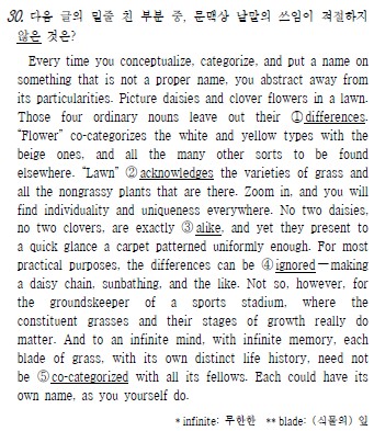 EFS 안녕하세요 토대 영어입니다. 오늘은 26년 3월 고3 모의고사 중 오답률 1위였던 30번 문제를 살펴보도록 하겠습니다. 어휘 문제가 오답률 1위를 차지한 것은 상당히 이례적인 경우라고 할 수 있습니다. 이 문제는 범주화(categorization)에 관한 문제입니다. 오답률 81%의 문제임에도 불구하고, 사실 첫 문장부터 핵심 주제가 언급되고 있습니다. 즉 개념화 또는 범주화 할 때마다 그것의 독특함을 무시한다 (abstract away from its particularities)고 하였습니다. 그리고 이에 대한 예로서 ‘잔디밭의 데이지와 클로버 꽃 (daisies and clover flowers in a lawn)’을 상상해보라고 하였습니다. 다음 문장에서 다시 이 네 개의 보통 명사....... <img src="https://blogthumb.pstatic.net/MjAyNjAzMzBfMjQ3/MDAxNzc0ODQyMTE2Mzk1.t3Fp4i17DNM9AOMPcFW3RB8RhSYdSIp4Bhj_uQDWeSgg.k0NkLkCZ074jwtboCxlTHxASYDOuu47AFpbxpd6mtqUg.JPEG/30.jpg?type=s3" />