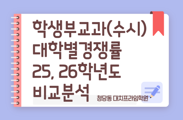 고려대 출신 선생님 수학고사 전국 48등 이력 선생님 등 과목별 실력파 선생님들과 함께하는 #청당동수학학원 #청당동영어학원 대치프라임학원 입니다 한 해의 입시가 모두 마무리되고 있는 시점입니다 청당동 대치프라임학원은 작년 한해에도 고3 재원생 수능 1등급 학생 그리고 정말 많은 과목별 1등급 학생들 성적 향상 학생들과 함께하였습니다 입시를 뒤돌아 보며 서울 수도권 주요 대학들의 #수시모집 #학생부교과 #경쟁률 을 25학년도 26학년도 비교해 보면서 분석해 보도록 하겠습니다 청당동수학학원 청당동영어학원 대치프라임 이미지 순서는 수시모집 학생부교과전형 기준 2026학년도 경쟁률이 높았던 대학부터 순서대로 나열하였습니....... <img src="https://blogthumb.pstatic.net/MjAyNjAyMjFfMjgy/MDAxNzcxNjQ5ODcwNjky.7QUqmT2TpTMNTg55_rTmjSfKtgZX3CbbZKxRHkUuVvAg.OZXRucoavP45UO4-ys7DtzjNGrYz51pZA_PVgLUt_mIg.PNG/%B1%B3%B0%FA%BA%D0%BC%AE0%B4%EB%C7%A5.png?type=s3" />