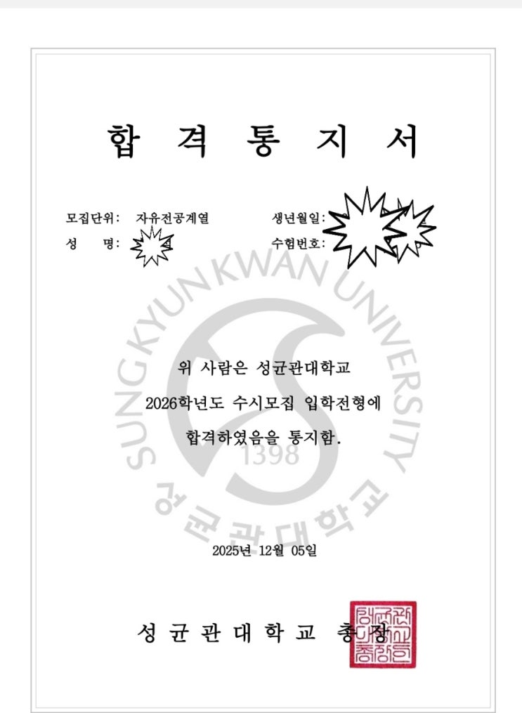 성균관대 수시 합격 : 너무 늦게 소식을 전해...미안함