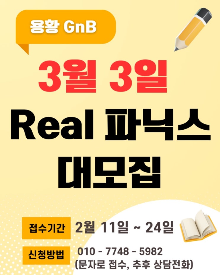 This is real Phonics. 봄을 맞이해 용황GnB에서 ‘3월 3일 파닉스반 대모집’을 시작합니다❣️ 모집 기간은 2월 11일부터 24일까지이며 신청 접수 번호는 010-7748-5982이며 문자로 먼저 접수 주시면 추후 상담전화 드리겠습니다. #용황지앤비 #경주영어학원 #파닉스 #3월개강 #경주영어전문 #경주핫플 #용황gnb #유림초영어 #황남초영어 #파닉스 #3월개강 #황성지앤비 #경주지앤비 #gnb영어학원 #동천초영어 <img src="https://blogthumb.pstatic.net/MjAyNjAyMTBfMjcg/MDAxNzcwNzI2NTY4OTMx.dsXFkKSDSpeJBQSHsAO3l9XDKpWSF1DpplOCRaYmhUUg.p-unPebv71MX7SFbptH-LjUuvfuRyIH9iYQ-k7CWW00g.JPEG/FFFFCD8C%A3%ADD2E6%A3%AD44E7%A3%ADBF56%A3%AD077B4B927ACC.jpg?type=s3" />