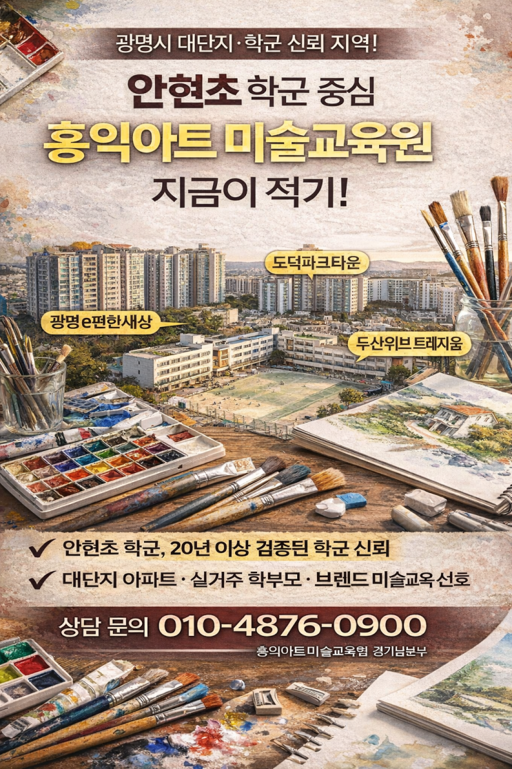 광명시 안현초등학교 학군 중심 e편한세상·도덕파크타운 미술학원·미술교습소 창업 왜 홍익아트 미술교육원이 적합할까요? 광명시에서 주거 안정성과 학군 신뢰도가 함께 형성된 지역, 바로 안현초등학교 학군입니다. 이 지역은 대단지 아파트를 중심으로 실거주 비율이 높고 초등 저학년부터 중학년까지 지속적인 예체능 교육 수요가 안정적으로 유지되는 것이 특징입니다. 홍익아트 경기남본부장· 방문미술 영통지사장 박상영 010-4876-0900 (수원시 영통구·팔달구, 과천시, 안양시, 의왕시,오산시 홈스쿨 가맹 가능한 지역입니다.) 안현초 학군, 학부모 신뢰가 쌓인 지역 안현초등학교를 중심으로 한 생활권은 오랜 기간 동안 학군....... <img src="https://blogthumb.pstatic.net/MjAyNjAyMDdfMTc3/MDAxNzcwNDU1OTA3NTUw.H_WNGLLJZHTG9tSNhubEx10Moh68x5Wfxocja5dlTbwg.F0z-dxsHXNF09HGXRJoeVQf1w3JPfFnH7PDGndenoNcg.PNG/%B1%A4%B8%ED%BE%C8%C7%F6%C3%CA.png?type=s3" />