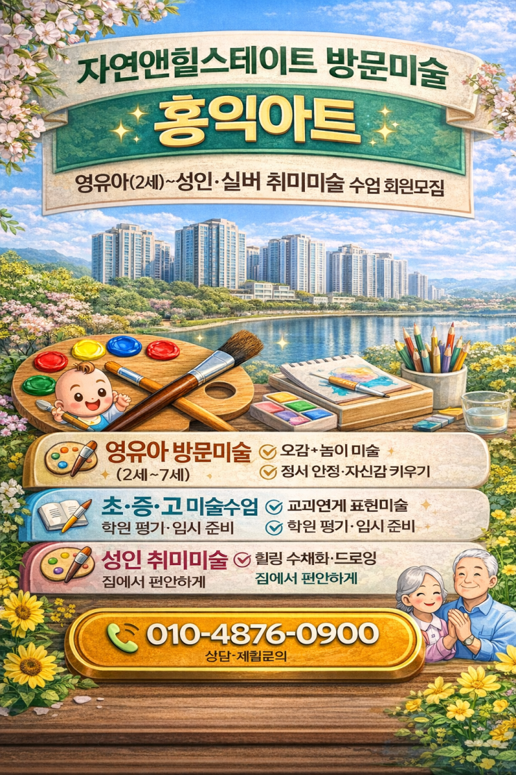 광교자연앤힐스테이트 방문미술 홍익아트 영유아(2세) ~ 성인 · 실버취미미술 회원모집 자연앤힐스테이트에서 아이 미술수업, 그리고 부모님·어르신 취미미술까지 집에서 편안하게 받는 방문미술 수업을 시작해보세요. 홍익아트 방문미술은 영유아부터 초·중·고, 성인, 실버세대까지 연령별·목적별 맞춤 1:1 방문수업을 진행합니다. 영유아 방문미술 (2세~7세) ✔ 오감 자극 놀이 미술 ✔ 촉감·색감 탐색 활동 ✔ 언어 표현 확장 ✔ 정서 안정 및 자신감 형성 2세부터 가능한 수업으로 놀이 중심 활동을 통해 자연스럽게 표현력과 집중력의 기초를 만들어드립니다. 이 시기에는 결과보다 자유로운 경험과 감정 표현이 가장 중요합니다. ....... <img src="https://blogthumb.pstatic.net/MjAyNjAyMTJfMTM5/MDAxNzcwODIyMTA3ODQ1.zWlaS30VFws97LNubW_OOE6EYG8rwIm0Q1m32ZPEFIYg.tVTCVjzzG0GTUA2c-is2uyN4_va2X8uXVPzy61V5d3gg.PNG/%B1%A4%B1%B3%C0%DA%BF%AC%BE%D8%C8%FA%BD%BA.png?type=s3" />