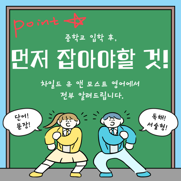 새학기, 중학교 입학 후 가장 먼저 잡아야 할 것 안녕하세요~ 침산동 차일드유 앤 모스트 영어입니다. 3월이 되면 교실 분위기가 달라집니다. 특히 중학교에 처음 입학한 아이들은 설렘과 긴장이 함께 보입니다. 새 교복, 새로운 친구들, 새로운 선생님. 모든 것이 새롭습니다. 하지만 한 달 정도 지나면 학부모님들께서 가장 많이 하시는 말이 있습니다. “생각보다 영어가 어렵네요.” 초등학교 때 영어를 잘하던 아이들도 중학교에 올라오면 당황하는 경우가 많습니다. 왜일까요? 중학교 영어는 단어, 문장 구조, 서술형까지 모두 동시에 요구되기 때문입니다. 새학기에 가장 먼저 잡아야 할 것 많은 분들이 문제집을 더 풀려야 할지, 단어를....... <img src="https://blogthumb.pstatic.net/MjAyNjAzMDVfMjYz/MDAxNzcyNjg4NDc2ODgy.cA4gsemHSSqkry4xLGsoTflB3xdK0sCiD9b-Gs5Cfx4g.pzS10Jm2Bi7DU6jACgly6q2g87iQdHGC2Qqgnw8--gcg.PNG/1.png?type=s3" />