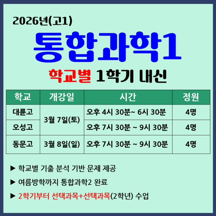 주1회 120분 / 자체 교재로 진행됩니다. 통합과학은 단순 암기만으로 해결되지 않습니다. 내신의 핵심은 결국 '킬러 파트'입니다. 물리학의 역학, 화학의 양적 관계 등 고2 심화 개념까지 연계되는 변형 문항을 완벽히 정복해야 1등급이 가능합니다. 매년 변하는 학교별 출제 라인업과 선생님별 성향을 실시간으로 분석합니다. 난이도 변화에 흔들리지 않는 탄탄한 실력을 만드는 것이 우리 학원의 목표입니다. 단순 진도 빼기 수업이 아닙니다. 학교별 부교재와 유인물까지 꼼꼼히 반영한 '개별 맞춤형 커리큘럼'으로 완벽한 내신 대비를 합니다. 안내문에 없는 학교 내신반은 전화 문의 주세요. 상담 전화 : 053-743-0611 <img src="https://blogthumb.pstatic.net/MjAyNjAyMTFfMTE4/MDAxNzcwNzg4ODQ1NDAx.5S1-7EfSrETT-z8b2rQMCtanhB43T61UixMxa5gtGswg.T9u424ENNZPrsl8ubE2o1QnH9THWwkv1OT670h4azbwg.PNG/3%BF%F9_%B0%B3%B0%AD%28%C5%EB%C7%D5%B0%FA%C7%D01%29.png?type=s3" />