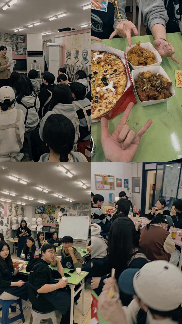 26년 겨울방학 특강이 어느덧 마지막 주차에 접어들었습니다. 짧지만 밀도 높았던 특강 기간 동안학생들의 실력은 눈에 띄게 성장했고, 그림에 대한 자신감도 한층 더 올라간 시간이었습니다. 예비고1을 위해 원장님의 입시설명회가 진행되었고, 성공적인 2026학년도 입시 결과를 함께 축하하며 치킨·피자 파티로 즐거운 마무리까지! 새출발을 앞둔 새 학기,우리 엘리트반 친구들 모두 화이팅입니다! <img src="https://phinf.pstatic.net/image.nmv/blog_2026_02_11_59/JQnXzAn2i5_03.jpg?type=f480x480" />
