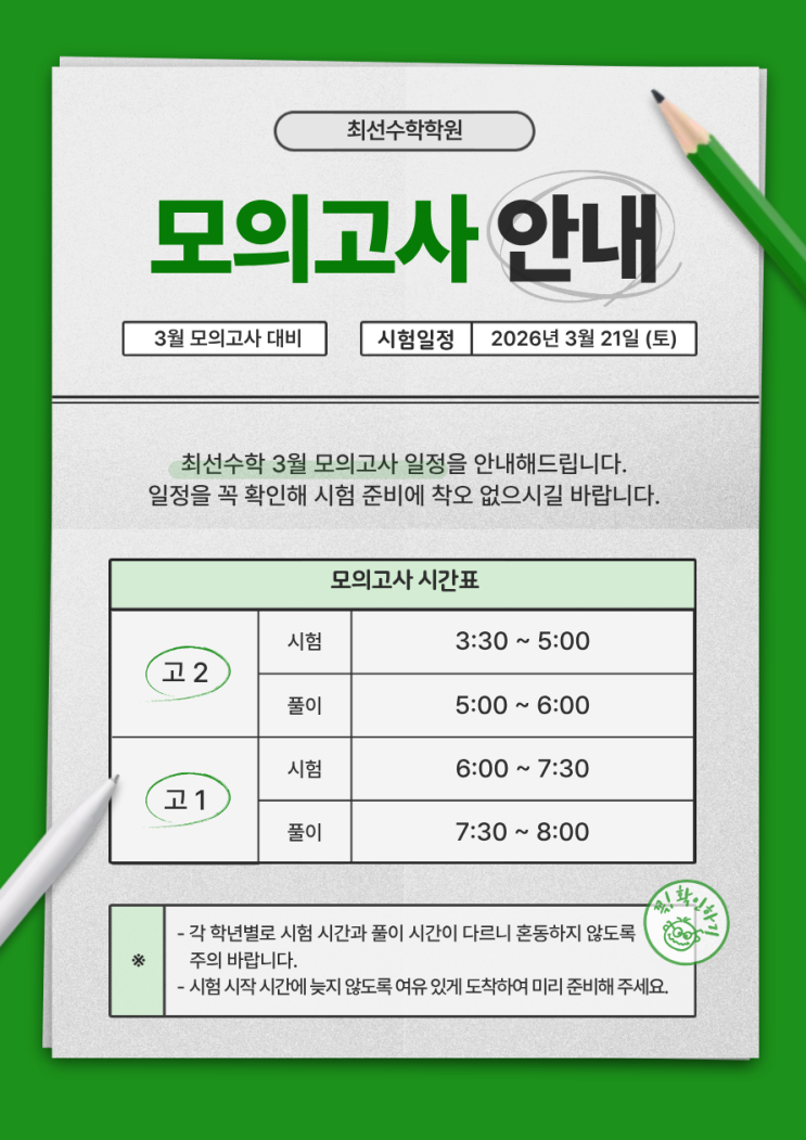안녕하세요, 최선수학입니다! 2026년도 3모를 대비해 모의고사를 실시합니다! 대상: 고 1, 고 2 일시 : 2026. 03. 21(토) 각 학년별로 시험 시간과 풀이 시간이 다르니 혼동하지 않도록 잘 보고 와야 해요! 꼭 본인이 지정된 시험 시간 10분전에 미리 와서 착석해주길 바랍니다. #세종시수학학원 #최선수학 #수학은최선 #최선수학학원 #도담동수학학원 #도담동학원 #수학학원 #세종시학원 #세종시수학 #도담동수학 #도담동수학학원추천 #세종시수학학원추천 #입결좋은학원 #대입 #수학공부 #시험공부 #모의고사 #학력고사 #시험 #3모 #시험대비 <img src="https://blogthumb.pstatic.net/MjAyNjAzMTlfMTI2/MDAxNzczOTIwNjIwNzkw.vKthikz8AWPt8xIuGUVqBJzipAlu_uJ5jpMXvomgndAg.McS-uEMqYS7ZoTTR_NLS-3K9TeNNd78tKFTmStGkHKwg.PNG/%C1%A6%B8%F1%C0%BB_%C0%D4%B7%C2%C7%D8%C1%D6%BC%BC%BF%E4._%2824%29.png?type=s3" />