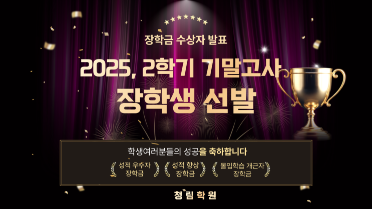 경기 수원 권선구 #고색고, #영신여고 #수학, #영어, #과학 #내신,# 대입 논술, #수능 대비, #대입 #컨설팅까지 한 번에 해결 하는 Best 1, #청림 #입시학원. 이유는 바로 24년의 노하우와 깐깐한 #교육 시스템 안녕하세요. 청림학원입니다. 2025년 2학기 기말고사 결과에 따른 장학생 선발 및 2026학년도 대학입학 합격자 발표입니다. 지난 2025년도 역시 힘차게 달려온 우리 학생들에게 아낌없는 박수를 보내드립니다. 2026년 새해 새학기 더욱 발전 된 모습을 기원합니다. 청림의 모든 학생들 2026년에도 화이팅 하세요~ < 청 림 학 원 > blog.naver.com/chungrimedu 수원시 권선구 고색동 408-23 (고색역 3번 출구) 상담 예약 : ☎ 031....... <img src="https://blogthumb.pstatic.net/MjAyNjAxMTRfNTgg/MDAxNzY4MzkyMDA5MDcy.89hhTftRFSFCyHs4jg2ef6-n-3wWxhIfjk6ZqdVofC4g.-1h9cPAuO-MYyOiBsx-0EXxr0trM2KlAU72uHB3SAPkg.PNG/001.png?type=s3" />