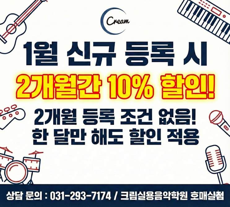 [공지] 크림실용음악학원 호매실점, 1월 신규 등록 시 '2달간 10% 할인' 깜짝 이벤트!