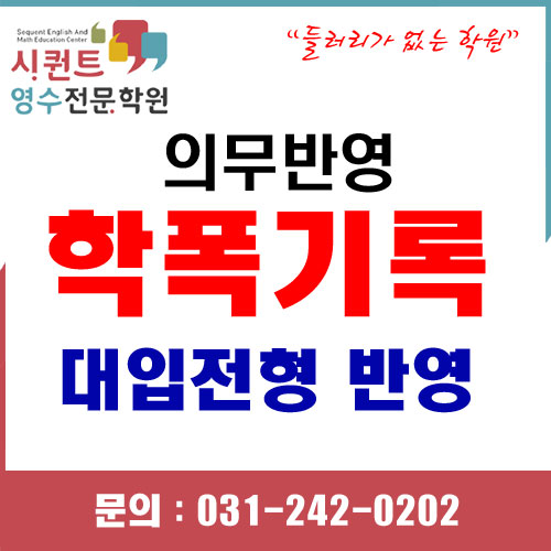 정보가 경쟁력입니다! 단 한 줄의 학폭기록이 합격과 불합격을 결정할 수도 있습니다 학폭에 아예 휘말리지 않도록 하는 것이 가장 중요합니다. 안녕하세요. 시퀀트영수학원입니다. 오늘은 학부모님이나 학생들은 반드시 알아야할 학교폭력 기록과 입시에 관련된 얘기를 하려고 합니다. 예전에는 크게 문제가 되지 않는다는 인식이 있었지만, 지금의 입시는 완전히 달라졌습니다. 대학입시 전형 전반에 걸쳐서 직접적인 영향을 미치는 핵심 변수로 자리잡았습니다. 학교폭력 기록은 이미 대학입시의 핵심 평가 요소의 하나가 되었고 그 영향력은 해마다 강화되고 있습니다. 2026학년도부터 대입부터 학폭조치사항은 모든 대입전형에서 의무적으로....... <img src="https://blogthumb.pstatic.net/MjAyNjAxMjNfMTQ2/MDAxNzY5MTUxNDY4NDkz.xOAkCj2BkvW4xbRnlDnEXtjSloZ3Sg1ru4a309wN6YIg.8i4xpnlz9aFG5yeoZioPd418LlaTXE4JzU-7MbLJBscg.JPEG/%C0%D4%BD%C3%B4%BA%BD%BA-%C7%D0%C6%F8%B1%E2%B7%CF.jpg?type=s3" />