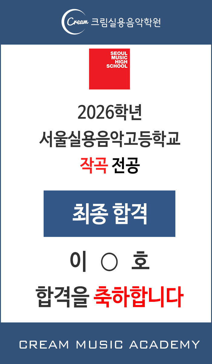 안녕하세요 크림실용음악학원 수원점입니다 크림학생들의 입시 합격 소식을 전해드립니다! 2026년도 서울실용음악고등학교 작곡 전공 이 ○ 호 학생이 최종합격했습니다! 열심히 노력한 학생과 선생님들 모두 수고하셨습니다. 앞으로 멋진 음악생활 하시길 진심으로 바랍니다. 바른 인성을 가진 뛰어난 음악인을 길러내는 음악전문교육기관으로 더욱 더 정진해 나가겠습니다. 감사합니다. #크림실용음악학원 #크림실용음악학원수원점 #실용음악학원 #취미음악학원 #성인음악학원 #입시전문음악학원 #작곡 #재즈피아노 #CCM #수원작곡입시 #수원베이스입시 #수원기타입시 #수원드럼입시 <img src="https://blogthumb.pstatic.net/MjAyNjAxMjZfMTA4/MDAxNzY5NDIwMTE4OTcz.SUPJL9wQEfADQoIWz6nKcj-n1IDEYC5qr7ibqM0DT3kg.g-8KpGIMpSIjb9e4cWl0RaJC3O5KdIrU9Sa35mJshBIg.PNG/%C0%CC%BC%B1%C8%A3-%BA%ED%B7%CE%B1%D7.png?type=s3" />