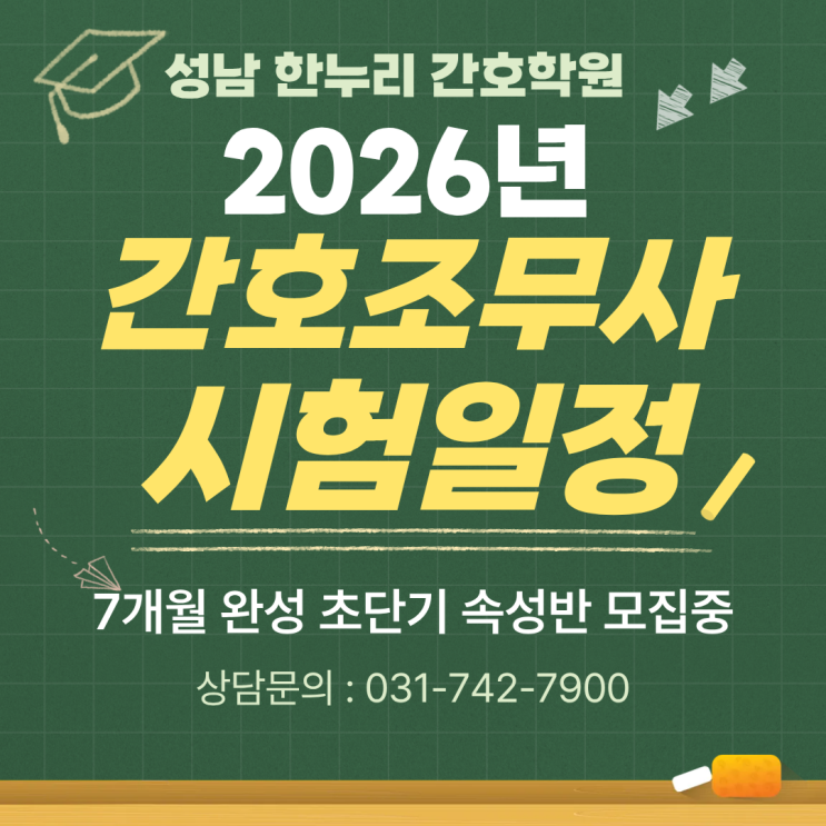 안녕하세요. 성남 최고의 시설과 우수한 강사진을 자랑하며 26여년간 꾸준히 사랑받아온 성남 한누리 간호학원입니다. 기관운영, 훈련과정 및 커리큘럼, 훈련생 관리에서 우수성을 인정받아 2025년 고용노동부 3년 인증을 획득하였습니다. 드디어 공고된 2026년 간호조무사 국가시험 시행계획 오늘은 2026년 간호조무사 시험일정 2026년 간호조무사 시험장소 응시수수료 및 원서 접수 방법 등 유의사항을 차근차근 하나씩 알아보겠습니다 2026년 간호조무사 시험일정 간호조무사 국가시험은 연 2회, 상반기(3월)와 하반기(9월)로 나누어서 시행됩니다. 특히 2025년부터 간호조무사 시험이 요양보호사 시험과 마찬가지로 상시 시험으로 변경됨에 따....... <img src="https://blogthumb.pstatic.net/MjAyNTEyMTZfMTc2/MDAxNzY1ODc0Nzk1Njc3.bgs1WvLPpPXOxvW2qQz94SYNAlaMs2dt8juIck_y61gg.X2b2vjUhWKJZc4JSzsg96rBQB9ueipImvHie7GYygtUg.PNG/1.png?type=s3" />