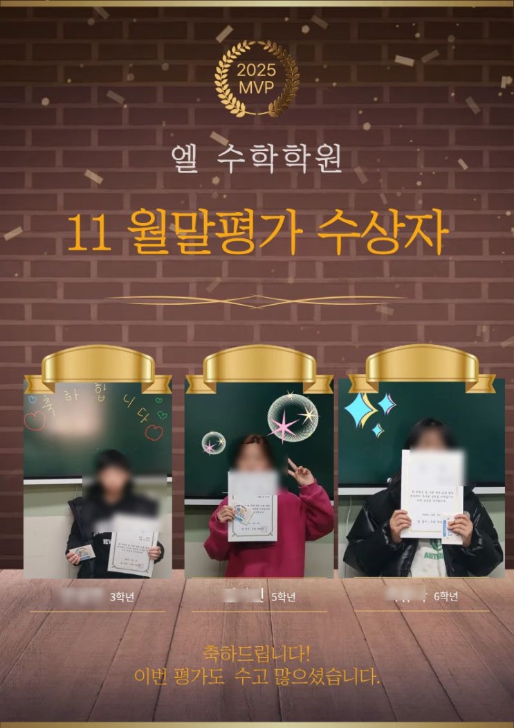매 달 마지막주 수/목/금요일은 월말평가를 치룹니다. 그 달에 배운 단원들을 다시 한번 복습하면서 내 실력이 어느 정도인지 가늠해 볼 수 있는 좋은 기회에요! 2025년의 마지막 월말 평가라 레벨 UP되어 조금 어렵게 출제되었어요. 그래도 열심히 시험에 임해준 친구들 덕분에 선생님은 오늘도 힘이 난답니다~~~ 엘학원 중원초후문 :상담전화 031)733-3524) 엘 영어 수학학원 금상초 맞은편 (상담전화: 031)733-3524) <img src="https://blogthumb.pstatic.net/MjAyNTEyMTZfMjQg/MDAxNzY1ODU5Mzg2Mzcx.0O_z7sit68T5FOP8eM7YDUc5NZpfUsN4QX2He5DnZRkg.GHrT3IjGE-hXBnSHRuuWF48PWlBFPlJjeSB4d7Z9v8Eg.JPEG/%C1%A6%B8%F1%C0%BB_%C0%D4%B7%C2%C7%D8%C1%D6%BC%BC%BF%E4._%281%29.jpg?type=s3" />