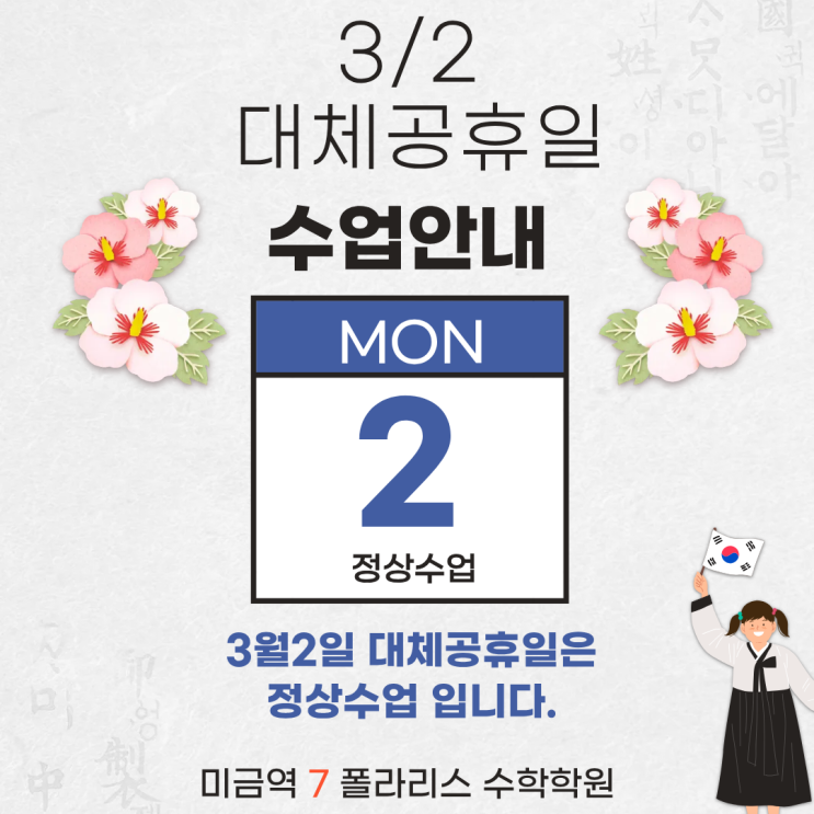 [미금역 수학학원]2026 삼일절 대체공휴일 수업안내