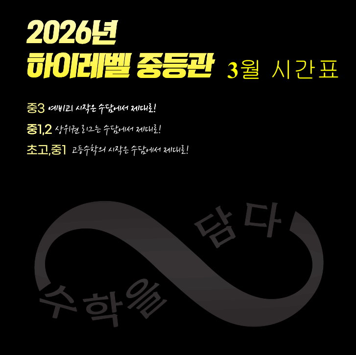 안녕하세요 수학을담다 입니다. 새학기를 맞아 저희 수학을담다 하이레벨 중등관에 대해서 안내드립니다. 저희 하이레벨 중등관은 1.담임선생님+클리닉선생님+중등관 담당 실장님 등 관리에 총력을 기울이고 있습니다. 고등관은 고등관대로 필요한 노력(수업,자료,클리닉등)이 있고, 중등관은 중등관대로의 세심한 관리와 다른 노력이 필요합니다. 그 부분에 최선을 다하고 있습니다. 2.고등수학을 배우는 중학생들은 고등 전문 강사들에게 수업을 들어야 합니다. 당연히 큰 차이가 있습니다. 아래는 저희 수학을담다 하이레벨 중등관에 대한 소개입니다. 2026년 꼭 기억되는 한 해가 될 수 있도록 수담이 함께하겠습니다. 감사합니다. 궁금하신....... <img src="https://blogthumb.pstatic.net/MjAyNjAyMTJfMTA3/MDAxNzcwODU3NDA1MzMw.Xy_YsWQ2vIfe7ZwQQCXnsT_imOJ2er-FIAqtZTsMNeIg.8ThTR1CbDV_MsZVE6Sn0I-XDt2dzGrf6c1vXhm1tVPUg.PNG/image.png?type=s3" />