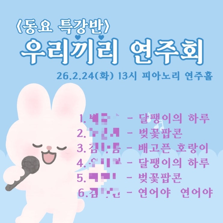 안녕하세요^^피아노리 음악학원입니다. 겨울방학에 동요특강을 진행했습니다. 처음에는 소리내기 쑥스러워 하던 친구들이 시간이 지날수록 가까워지며 표정도 밝아지고 소리도 하나가 되었답니다 매 시간 발성을 하며 호흡도 길어지고, 어려운 당김음, 붓점 리듬도 자연스레 표현할 주 알게 되었습니다. 높은 음도 제법 소리 냈습니다. (감동의 순간들을 모두 영상에 담지 못해 많이 아쉽네요) 다양한 느낌의 곡들을 배웠습니다. (8회 수업에 무려 10곡이나 불렀네요) 처음 만난 동요라 낯설게 느껴졌지만 초롱초롱한 눈빛으로 열심히 노래하는 사랑둥이들과 행복한 겨울이었습니다 마지막 시간에는 용기내어 독창도 해 보았습니....... <img src="https://blogthumb.pstatic.net/MjAyNjAyMjVfMTY3/MDAxNzcxOTg1NTI4NjMx.Tngrn4-aa1KYOOyvQi54wrinJKmq9OFZW0MriZLDrmMg.fjyvWTo7ONQDpDTqXLcxb1pogwVEpqC7XJ2OizZtV3Ag.JPEG/900%A3%DF1771985527620.jpg?type=s3" />