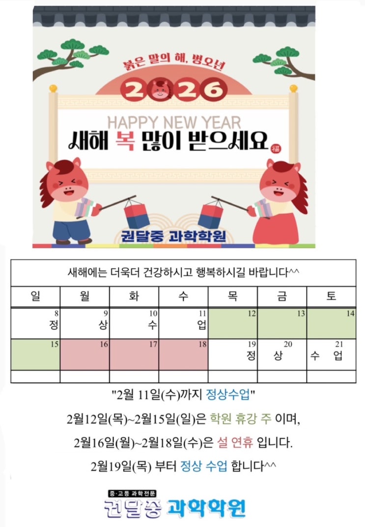 안녕하세요 이번 설 연휴 수업 안내 드립니다. 2월11일 수요일까지 정상수업 후 설연휴 안식주로 2월 12일 목요일부터 2월18일 수요일 까지 휴무 입니다. 학원 데스크 업무도 11일 수요일까지 이며 2월19일부터 정상 수업및 업무 진행됩니다. ☎️상담 및 문의 010 3025 5443 학교/학년/이름 문자 남겨 주시면 연휴 끝나고 순차적으로 연락 드리겠습니다 새해 복 많이 받으세요 <img src="https://blogthumb.pstatic.net/MjAyNjAyMTNfMjI1/MDAxNzcwOTI5MDkyOTg3.Eh5Xf4EP7YZnoBFwocEKKHRUtZyy8DRZPbfm_oThqAcg.3uElPIizVi_yLBKDW64AlldilE468mBQ6qFkWnA73Zgg.JPEG/IMG%A3%DF0672.JPG?type=s3" />