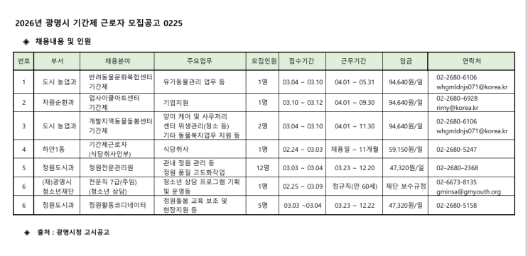2026년 광명시 기간제 근로자 모집공고 0225 입니다. 관심 있신 분들은 광명시청 고시공고에서 확인할 수 있어요. 사진을 클릭하면 크게 보실 수 있습니다. 자세한 사항은 광명시청 홈페이지를 참고하세요. <img src="https://blogthumb.pstatic.net/MjAyNjAyMjVfMTQ1/MDAxNzcxOTg1MTY2NTky.dfiMWebGMs0mvP76VYp1WnhqUb3cfc5ZAbXI7R3Z27Eg.w3e_OyXifK0m7mGeaf85FTeWMQpqBqTx8aYzBccJa_8g.PNG/2026%B3%E2_%B1%A4%B8%ED%BD%C3_%B1%E2%B0%A3%C1%A6%B1%D9%B7%CE%C0%DA_%B8%F0%C1%FD%B0%F8%B0%ED_0225.png?type=s3" />