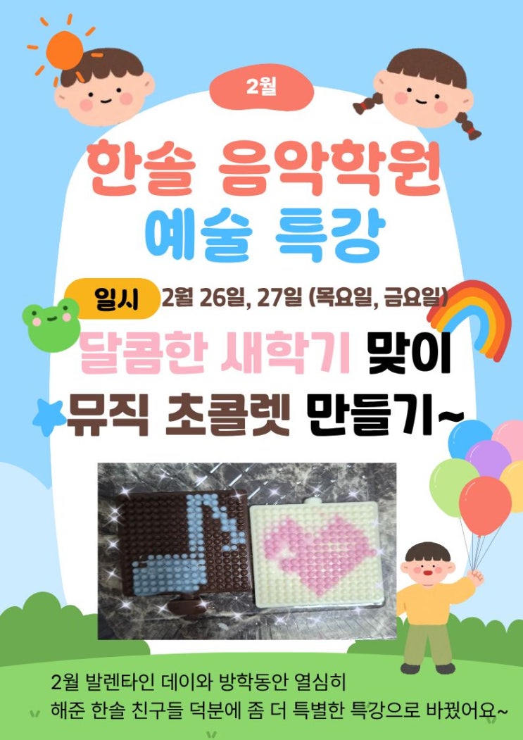 길었던 겨울 방학이 끝나가고 있네요~! 아쉽지만 우리 친구들의 새로운 시작이 기다리고 있어요! 이번 특강은 우리 한솔 친구들이 방학동안 열심히 해줘서 다들 실력이 엄청 올랐어요♥ (여담이지만 요새 상담 오시는 분들이 다들 한솔 친구들 실력이 대단하다는 소문을 듣고 오시더라구요^^) 2월 발렌타인 데이 기념해서 아이들이 제일 좋아하는 뮤직 초콜릿 특강 합니다^^ 이번주 상담 오는 친구들도 특강 참여 가능합니다^^ 요새 상담이 많아 아이들 수업의 질을 위해 3월에는 수업 대기를 할 수도 있을거 같습니다ㅠㅠ <img src="https://blogthumb.pstatic.net/MjAyNjAyMjVfMjY3/MDAxNzcxOTkwNjA4MDUz.OoKtZHjfI1AWyb8owg-5_h_kFlg0Bv5pDSQPHVgthUIg.axxEq0cWfq5UsVQ3QuQLyKTJ7yUylkZrktklkPGzha8g.JPEG/%C1%A6%B8%F1%C0%BB_%C0%D4%B7%C2%C7%D8%C1%D6%BC%BC%BF%E4._%281%29.jpg?type=s3" />