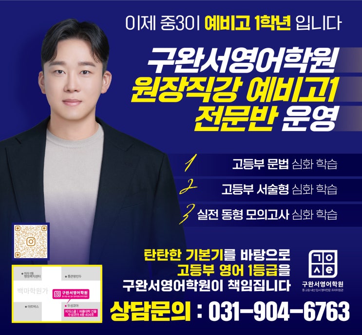 안녕하세요 학부모님들 구완서영어학원 원장 구완서 입니다. 학원은 기말고사 대비로 학생들과 호흡하며 열심히 대비를 하고 있습니다. 중등부 3학년을 마무리한 학생들은 "예비고1"이라 불리며 고등부 내신 및 입시를 위해 준비하는 시간을 갖게 됩니다. 이 시기가 고등부 3년의 당락을 좌우할 만큼 중요한 시기이기 때문에 학부모님들의 관심이 참 많으신걸로 알고 있습니다. 이에 예비고1반 수업 안내를 드리려 합니다. 저희 학원은 백석고 백마고 백신고등학교 세곳의 전문반을 운영하는 학원 입니다. 타 학원에서 흉내낼수 없는 자체교재와 수업자료로 학생들과 소통하고, 가장 높은 적중률을 기록하고 있습니다. 예비고1반 수업....... <img src="https://blogthumb.pstatic.net/MjAyNTExMjRfMTcy/MDAxNzYzOTkyMzEwNjA4.Pjunsu1-GkdyCecnvuw7r2AEJKarevjZYqV3ykSnsGgg.1GP1iU_GCE7oKQfpVBsM9HTh9kkQWhRvtIyCx2yICmIg.JPEG/%B1%B8%BF%CF%BC%ADT_%B9%F6%BD%BA%BD%A9%C5%CD_%C3%D6%C1%BE%BA%BB%284%29.jpg?type=s3" />