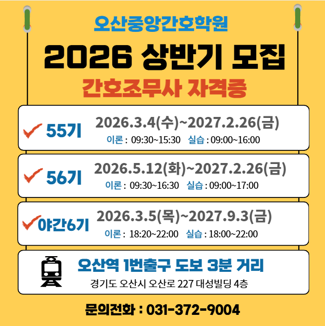 안녕하세요 오산중앙간호학원입니다 2026년도 상반기 모집 안내입니다. 오산중앙간호학원은 26년도 상반기에 주간 2개반, 야간 1개반이 개강될 예정입니다 ▶정규과정 26.3.4 주간반은 약11개월 9:30~15:30 (6교시) 점심시간 30분 ▶속성과정 26.5.12 주간반은 약9개월 9:30~16:30 (7교시) 점심시간 30분 주간 두반 모두 27년 3월 시험에 응시하시게 됩니다^^ ▶직장인반 26.3.5 야간반은 약15개월 16:20~22:00 (4교시) 모든 과정은 간호조무사시험 응시 조건인 이론740시간, 실습780시간, 총1,520시간을 이수합니다^^ 그밖에 내일배움카드, 국민취업지원제도등 궁금하신 사항은 카톡상담이나 031-372-9004 로 연락주시면 상세하게 안내해 드리겠....... <img src="https://blogthumb.pstatic.net/MjAyNjAxMjdfMTgx/MDAxNzY5NTAzOTMyMzc3.DJMrUOLJd1dLEaEfZ56PEtzctwYu5nCsWhiMekj4gBgg.LpWUokptBmK-oYl90_HCMrkad832z6N3o4aQQ0Z6IaUg.PNG/image.png?type=s3" />