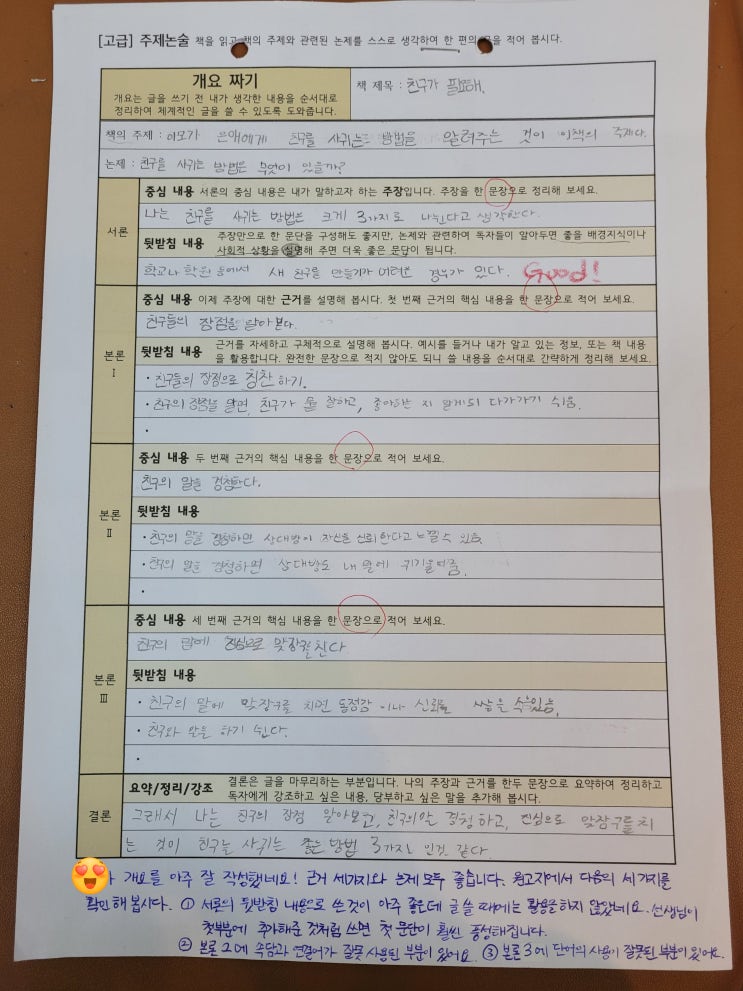 안녕하세요, 박준영논리속독학원 운정점입니다. 오늘은 초등 5학년 소희의 독서논술 수업 사례를 보여드리려고 합니다. 소희는 5학년이고 고급 과정의 '주제논술'을 쓰는 단계입니다. 초급 중급단계를 거치면서 3분당 3000자의 속도로 빠르면서도 정확하게 책을 읽습니다. 오늘은 '친구가 필요해'라는 책을 읽고, '친구를 사귀는 방법은 무엇이 있을까'라는 논제를 "스스로" 정했습니다. 논술문은 어떤 주제에 대한 자기의 입장을 밝히고 읽는 독자를 설득하는 글입니다. 논술문 쓰기 첫 번째 단계, 개요짜기 먼저 개요짜기를 합니다. 개요짜기는 어떻게 글을 쓸 것인지 뼈대를 세우는 것입니다. 개요짜....... <img src="https://blogthumb.pstatic.net/MjAyNTEyMDRfNTYg/MDAxNzY0ODM1NDU1MzY2.atbGqOPzF-RoBuxLpHrllkJtXnmc61LQNkDmYV8hPAcg.Ni5N3zv3nB144pD0pq51qvqOoAgldgcQBAx7kb4ft5kg.JPEG/20251203_150345.jpg?type=s3" />