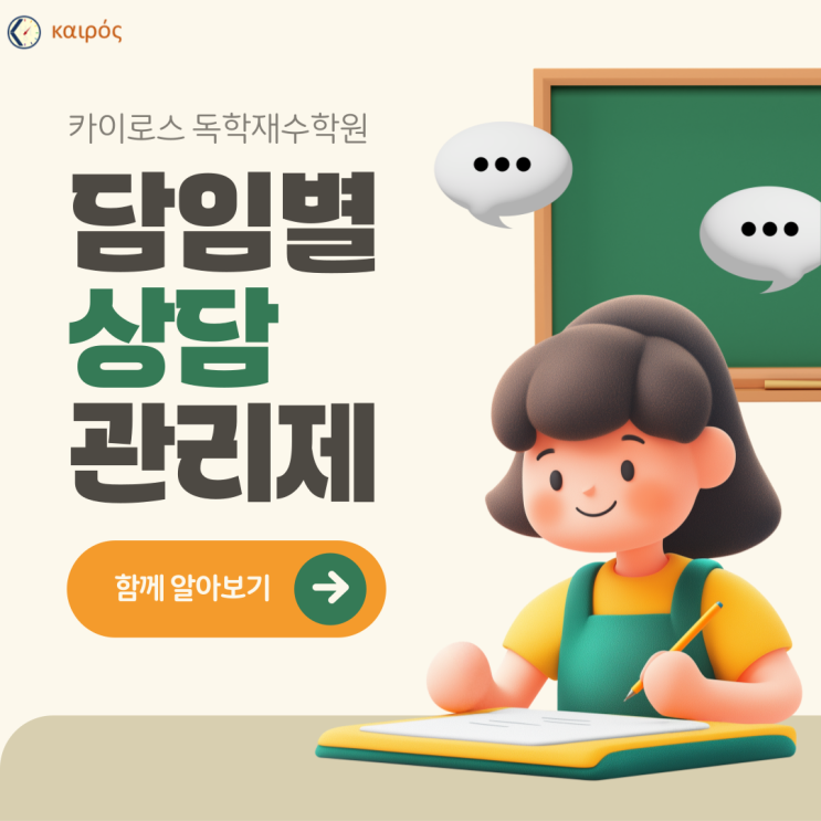 카이로스 1:1 담임(조교) 상담제도 안내 카이로스의 담임제는 조교가 학생과 1:1로 매칭되는 전담 학습 상담 시스템입니다. 담임과 조교가 분리된 구조가 아니라, 조교가 곧 담임이 되어 학생의 학습을 책임지고 상담합니다. 생활 관리와 학습 상담을 명확히 분리해 각 영역에 집중할 수 있도록 설계했습니다. ⸻ ✅ 학생 1명 : 조교 1명, 전담 담임제 카이로스에서는 학생 한 명당 전담 조교 1명이 배정됩니다. • 상담자가 바뀌지 않아 • 학생의 학습 흐름과 선택과목 특성을 누적해서 이해할 수 있는 구조입니다. 상담이 거듭될수록 점점 더 학생에게 맞는 방향으로 구체화됩니다. ⸻ ✅ 선택과목을 고려한 학습 중심 상담 담임(조교) 상....... <img src="https://blogthumb.pstatic.net/MjAyNTEyMjFfNzIg/MDAxNzY2Mjg4Njc5MTEz.DdorNl8XELTJRKY1lQorS8z9Yn9eRnUrYq1ZoXRsm8gg.GvdakirBJMCLy3EPcVAvbM92euXXCtJMNqbBSDwUh3Mg.PNG/001.png?type=s3" />