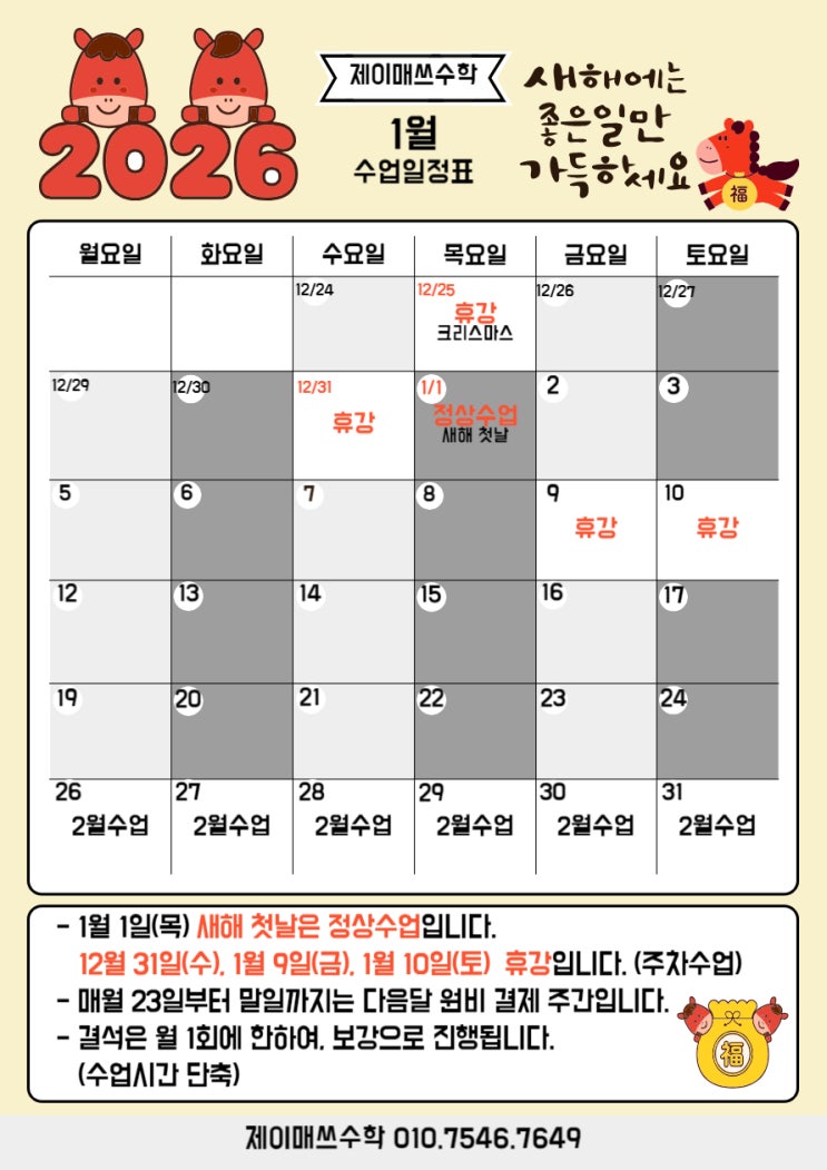 안녕하세요 제이쌤입니다. 2026년 붉은 말띠의 해의 시작이네요~ 붉은 말띠의 상징은 활력 열정 추진력이라는데 세가지를 모티브로 학생들과 열심히 달려나가는 한 해가 되기를 바라봅니다! 수업 문의시, 문자로 학교/학년/이름/통화가능 시간대 간단히 남겨주시면 수업 외의 시간에 확인하여 연락드리겠습니다! 감사합니다. <img src="https://blogthumb.pstatic.net/MjAyNTEyMjJfMTk2/MDAxNzY2MzY2ODU0NjIw.eNYKfSbCVpmQQ6NWhmc9ssqRYqNmaX22EZzqGt9hsVkg.YqC4lJbGL2mc-i0xFRe22wBDvEtnpDAsrhT12-k5Nbsg.JPEG/%C1%A6%B8%F1%C0%BB_%C0%D4%B7%C2%C7%D8%C1%D6%BC%BC%BF%E4__%BA%B9%BB%E7%BA%BB_%282%29-001_%282%29.jpg?type=s3" />