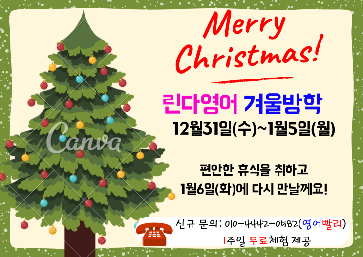 린다영어 겨울 방학 휴원 안내 1호점 한빛점 & 2호점 초롱꽃점 12월 31일(수)~ 1월 5일(월)까지 겨울방학으로 휴원합니다. 모두 재충전하고 와서 또 열공하기로 약속해요! 2025년 새해 1월 6일(화)에 또 즐겁고 행복하게 수업하겠습니다. 신규 상담: 010-4442-0582(영어빨리)로 문자 남겨주시면 1주일 무료체험 혜택 드립니다!^^ 편안하게 상담 문의 똑똑똑 <img src="https://blogthumb.pstatic.net/MjAyNTEyMjJfNDkg/MDAxNzY2Mzc3Nzc4MTA2.YQcqow3yWBiwCz-aPmxkcBQMKpUTC_ZlkZIcsnfb7ssg.ZJN0-Mpjo5KwvimzFXIBvGSiGv7WR4oSNcYPbs1aDxAg.PNG/Red_and_Green_Hand_Drawn_Christmas_Tree_Christmas_Art_Card.png?type=s3" />