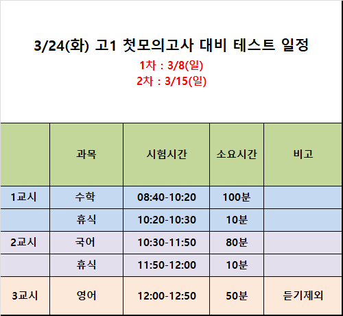 고1 첫 모의고사 대비 일정 알려 드립니다