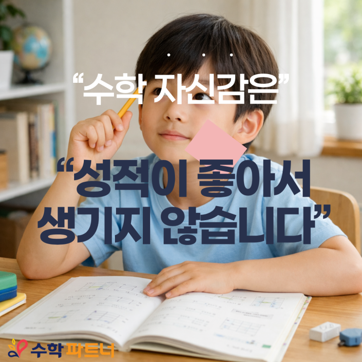 안녕하세요~ 수학파트너입니다! 수학 자신감은 언제 만들어야 할까요? “우리 아이는 아직 괜찮은 것 같은데요.” “지금은 성적보다 재미가 더 중요하지 않을까요?” 라고 생각하고 계신가요? 대부분의 학부모님들이 수학 자신감은 ‘성적이 오르면 자연스럽게 생기는 것’이라고 생각하세요. 하지만 실제로는 반대입니다. 수학 자신감이 먼저 만들어진 아이가, 성적을 끌어올립니다. 수학 자신감, ‘잘할 때’ 생기는 게 아닙니다 수학을 잘하는 아이들을 보면 공통점이 있습니다. 문제를 틀려도 멈추지 않고, 모르는 문제가 나와도 “해볼 수 있을 것 같다”는 태도를 가지고 있어요. 이건 타고난 재능이 아닙니다. ‘이해하고 넘어간 경험’....... <img src="https://blogthumb.pstatic.net/MjAyNjAxMjFfMjYx/MDAxNzY4OTg3Nzk1OTg2.FxTonSJ-mpxw5LIYRyux22pf6MnVg68l4zczspRgRIAg.NpLWHiq7yyI6dY8R-1XhOp05t8uE8jxxf7WLzhbLTecg.PNG/1.png?type=s3" />