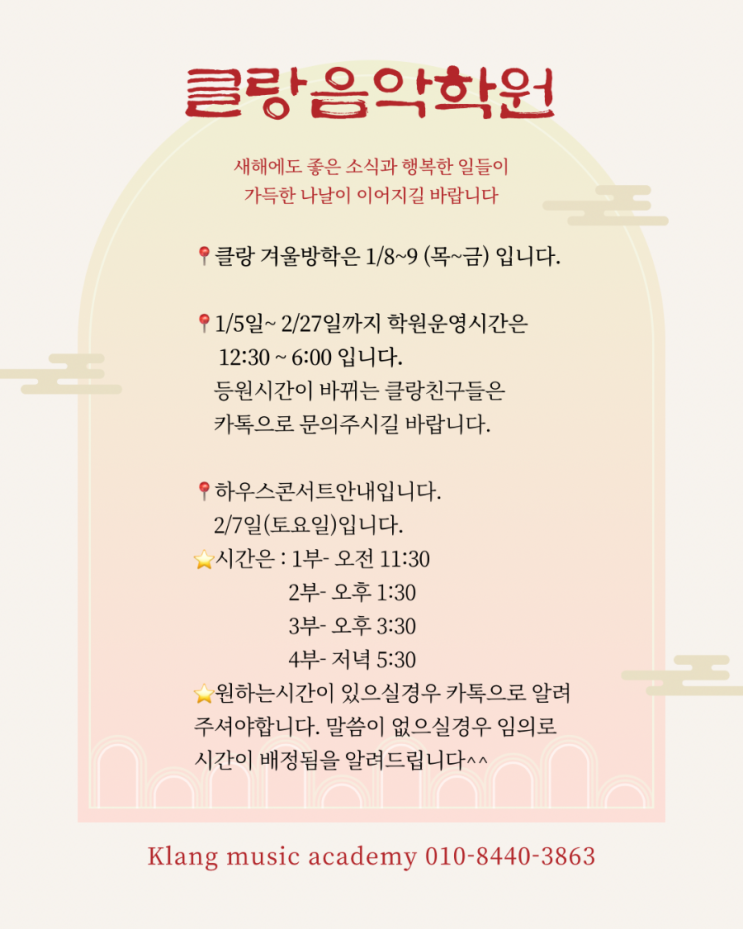 겨울방학 학원운영시간 및 하우스콘서트 안내입니다