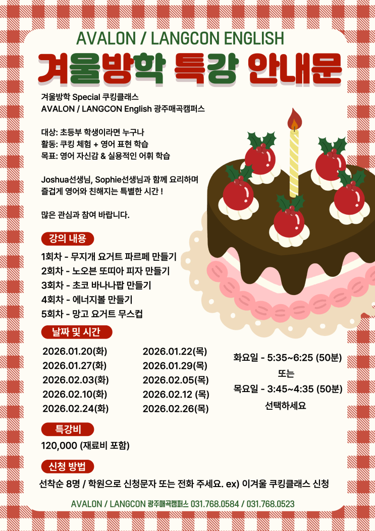 Sophie쌤 & Joshua쌤과 함께 맛있게 배우는 쿠킹클래스 Jane쌤의 기초를 탄탄히 DB 부터 DA 학생들을 위한 초등 기초 문법 Lisa쌤의 알듯한 문법, 서술형으로 정확히 알게 되는 시간 JB부터 JI 단계 겨울방학은 단순히 쉬는 시간이 아니라 다음 학년을 준비하는 가장 중요한 시기입니다. 아발론랭콘 광주매곡 캠퍼스의 겨울방학 특강은 선행보다 먼저 아이의 공부 체력과 사고력을 키우는 데 집중합니다. ❄️ 겨울방학 특강, 이런 학생에게 추천합니다 학년이 올라갈수록 공부가 버거워지는 아이 문제를 보면 바로 포기하려는 아이 설명은 이해하지만 스스로 정리하지 못하는 아이 겨울방학 동안 생각하는 힘 + 표현하는 힘....... <img src="https://blogthumb.pstatic.net/MjAyNjAxMDZfMTI2/MDAxNzY3Njk2Mjc2MTI5.kITifV8dosVpPcf6EieIlC94vPkwjvJmK3CHjtTw1Xgg.twGwRH8n4XXAdnmS1q1tpxyRTHL4cCpWrLK4G5dtHZkg.PNG/%C4%ED%C5%B7%C5%AC%B7%A1%BD%BA_%BB%E7%C1%F8.png?type=s3" />