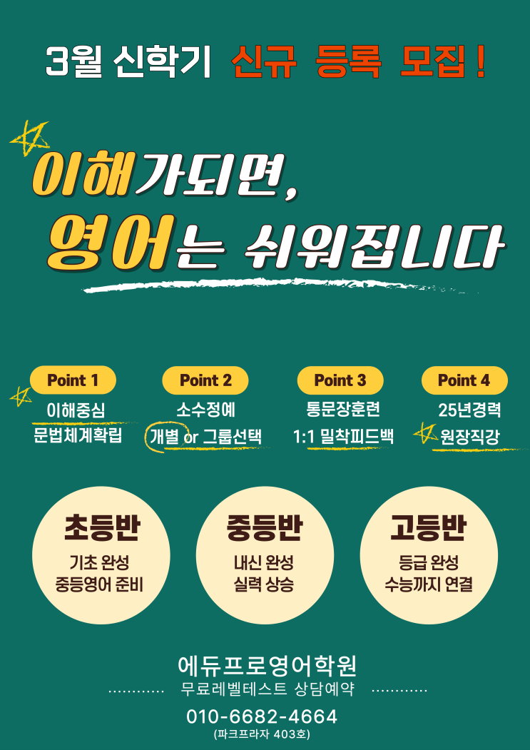 안녕하세요, 옥정동 에듀프로영어학원입니다. 영어를 오래 배웠는데도 막상 시험에서 흔들리는 이유는 무엇일까요? 많은 경우, ‘암기’는 했지만 ‘이해’가 되지 않았기 때문입니다. 이해가 되면 영어는 쉬워집니다. 그 방향으로 수업을 운영하고 있습니다. 초등 영어 초등 시기는 영어의 기초 체력을 만드는 중요한 시기입니다. 파닉스를 정확히 완성하고, 문장을 스스로 읽을 수 있도록 훈련합니다. ✔ 파닉스 완성 ✔ 문장 읽기 훈련 ✔ 기초 문법 감각 형성 기초가 탄탄하면 중학교 영어가 훨씬 수월해집니다. 중등 영어 중등 영어는 내신이 곧 실력입니다. 교과서를 철저히 분석하고, 문장의 구조를 이해하는 수업으로 흔들리지....... <img src="https://blogthumb.pstatic.net/MjAyNjAyMTZfMTAg/MDAxNzcxMjMyNzI0NzI2.4n7kPdbawlyO_b4xr_kZmvGyTWGx7Arbd6YYi3njyaEg.9t_o8tQ_rN0HWd6R7DbHnMjlKVB-wtho1AhW-h2o-TIg.PNG/%C0%CC%C7%D8%B0%A1%B5%C7%B8%E94664.png?type=s3" />
