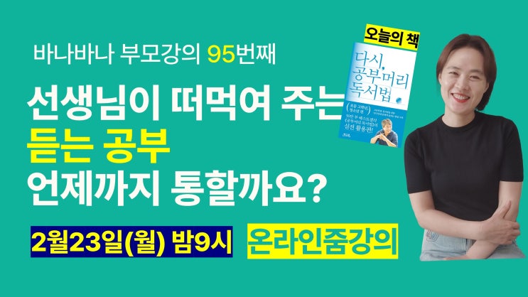 바나바나 부모강의 안내 ■ 매주 월요일 밤9시 ■ ■ 95번째 강의 ■ 오늘의 책 : 다시, 공부머리 독서법 (고학년 편) "학원은 잘 다니는데, 왜 스스로 생각하질 못할까요?" 스마트폰만 쥐고 있는 아이를 보며 답답하셨나요? 저는 이 책을 읽고 아차 싶었어요. 떠먹여 주는 '듣는 공부'에 익숙한 아이들 90%가 중학교 진학 후 성적이 곤두박질친다는 무서운 진실 때문이죠. 오늘 밤, 뻔한 독서 권장이 아닌 명확한 실전 훈련법을 파헤쳐 볼게요. 강의는 단 한 번! 오늘 밤 강의를 놓치지 마세요! ✅ 이런 분들 꼭 오세요! ✔️ 학원 숙제만 겨우 하고 스스로 공부할 힘은 없는 아이를 둔 분 ✔️ 글밥 긴 책....... <img src="https://blogthumb.pstatic.net/MjAyNjAyMjNfNjIg/MDAxNzcxODI0NDA5MzYz.4TIIgVwLrDS5zanYdIRLBVJQ0fIneJml1vDZ16UVjAMg.9KmZrZsot3-f5QdFixvsALXCT_kz3qbNmibEKgOBsGEg.JPEG/95_1_%B4%D9%BD%C3_%B0%F8%BA%CE%B8%D3%B8%AE_%B5%B6%BC%AD%B9%FD_%BE%E7%C1%D6%BF%C1%C1%A4_%B9%CC%BC%FA_%B0%A1%BA%A3_%BA%CE%B8%F0%B0%AD%C0%C7.jpg?type=s3" />