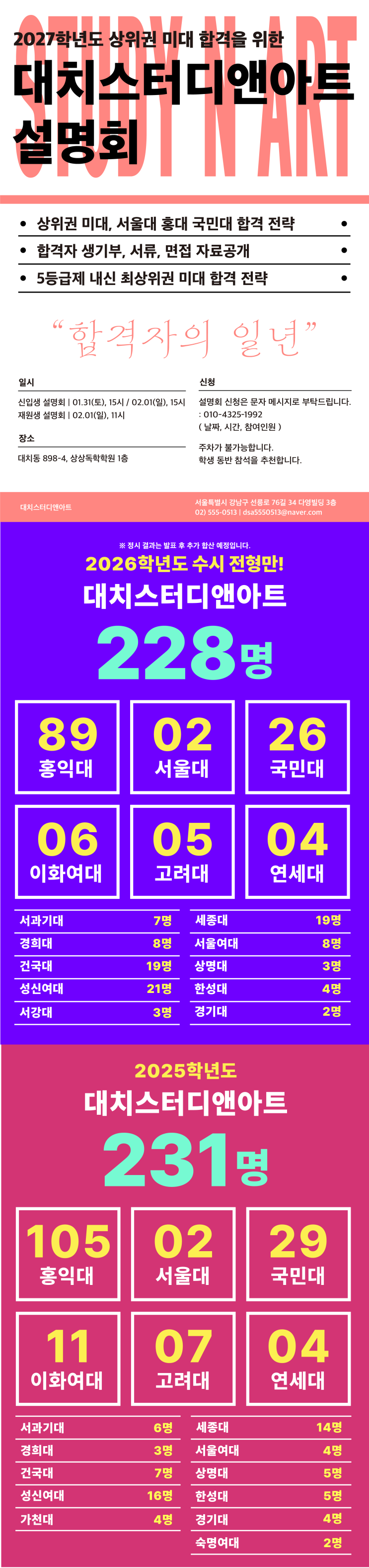 스터디앤아트 상위권 미대입시를 위한 스터디앤아트 입시 설명회 안녕하세요. 강원장입니다. 이제 엊그제 정시 다군 실기를 마무리 하면서 학생들의 26학년도 입시는 사실상 수업이 종료 되었습니다. 올 한해 폭풍처럼 입시를 하며 지나갔기에 조금 쉬고 싶은 마음이 굴뚝 같지만, 어김없이 올해 입시는 또 새롭게 시작해야 하는 시점에서, 재원생 부모님들의 문의가 많기에 빠르게 입시 정비로 들어가려고 합니다. 작년 재작년 기준 입시 설명회는 모두 500여명의 인원으로 조기 마감된 만큼, 빠르게 신청해 주세요. 아직 정시 결과 입결이 나오지 않았기 때문에 조만간 입학 결과를 정리해 드리겠지만 올해 대치스터디앤아트의 상위권 미대 비....... <img src="https://blogthumb.pstatic.net/MjAyNjAxMjJfMjE0/MDAxNzY5MDgyODY3NjU0.OpFBFkpyq6a04_BINwSbxDZsN4EEuRVp0y0TcYNjnFYg.ADpaJCEo5ly0L2P-e4ISGBNrOYM-6CcG-9pNdbZgGJUg.PNG/image.png?type=s3" />