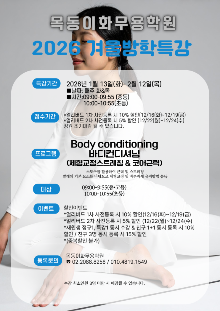 안녕하세요^^ 방학특강안내드립니다. 방학특강 관련 문의사항은 학원직통번호로 (010.4819.1549)문자 남겨주시면 순차 회신드리겠습니다✨️ 이벤트도 많이 진행하고 있으니 꼭 참고하시어 혜택 받아가세요✨️ #목동발레 #목동발레방학특강 #오목교발레방학특강 #목동이화무용학원 <img src="https://blogthumb.pstatic.net/MjAyNTEyMTlfMjg2/MDAxNzY2MTM4OTAyMjEz._-bNAu0K0fDrMLAfnJDaeEZl97CFn4CX7JguxM6GFtwg.UD1HonvK7LJaztWEXQKNMVbnxvIfGhn9H1GEKYIldVkg.PNG/900%A3%DF%C1%A6%B8%F1%C0%BB%A3%AD%C0%D4%B7%C2%C7%D8%C1%D6%BC%BC%BF%E4%A3%DF%A3%DF%BA%B9%BB%E7%BA%BB%A3%AD001%A3%A81%A3%A9.png?type=s3" />