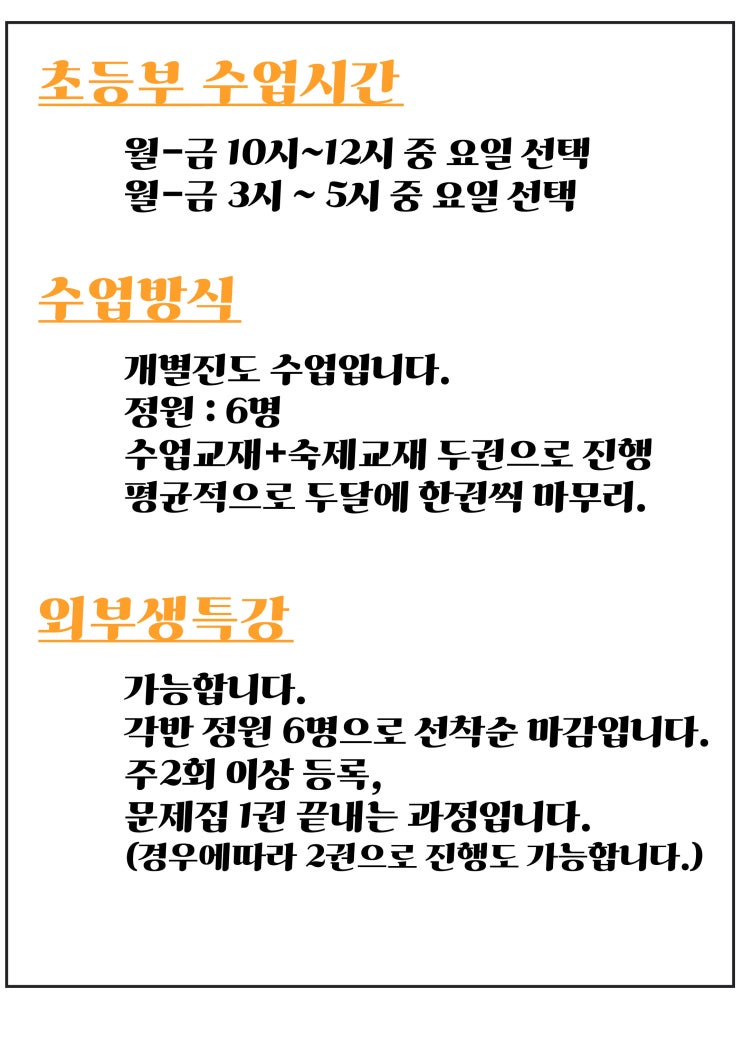 초,중,고등부 각 오전특강 있습니다. 재원생, 외부생 가능하며 정원 선착순 마감합니다. 초등부 정원은 6명이고 수업시간 교차수강 가능합니다. 중등부는 기본 타임 아래와 같이 안내드립니다. 각 반별로 (예 중1반, 중3 선행반 ) 등 특성이 달라서 전화상담후 반을 자세히 안내드립니다. (무작위로 합반하지 않습니다 ^^) 고등부 안내입니다 기본과정 하는 학생도 꼼꼼하게 지도하며 스스로 풀이할수 있도록 지도합니다 :) 문의 : 01076437424 https://blog.naver.com/som2132/224113327985 <img src="https://blogthumb.pstatic.net/MjAyNTEyMTlfMjkx/MDAxNzY2MTI1NDA5NDQ2.OwWrOQcoFv5-28tio7uWvqGTFUG4vQbbFgAlULkvF6sg.pmU5s-0g_l1at3qn1io6cIdc3Ko8_8KX73F9zwy1hxAg.JPEG/1.jpg?type=s3" />