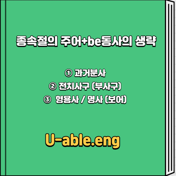 종속절에서 '주어+be동사'가 생략된 구조, 즉 접속사에 과거분사‧보어[명사(구), 형용사(구)]‧부사(구)[전치사구]가 이어진 표현에 쓰이는 접속사는 ‘although, as[~하듯이], as if, as soon as, as though, even if, if, once, though, unless, until[과거분사만 쓰임], when(ever), where(ver), whether ... or, while’이다 1️⃣ 원래 기본 구조 영어의 종속절(부사절) 기본 형태는 접속사 + 주어 + 동사 When she was young, she lived in Paris. If it is necessary, call me 이처럼 접속사 뒤에는 원래 완전한 문장이 옵니다. 2️⃣ 그런데 어떤 경우에 줄일 수 있을까 다음 조건이 맞으면 주어 + be동사를 생략할 수 있습니....... <img src="https://blogthumb.pstatic.net/MjAyNjAzMTBfMTEx/MDAxNzczMTIxNDk0MTQz.LBvEymHRFj4zH57d8EhQvAHTEonnZUcTnYLFyfCqfl4g.wctDwNtOFqTgj9yvlTjtr2DfmC_xA81JgmCq0eBXVGcg.PNG/image.png?type=s3" />