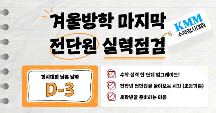 안녕하세요.^^ 개학 전 마지막 실력점검! 2월 KMM에 응시하세요. 이번 KMM은 우리 아이들이 지난 1년을 잘 보냈는지 증명하는 시간으로 만들어 보세요. 초등 한정, 이전 학년에서 배운 전 단원이 출제 범위로 구성됩니다. *기간: 2월 23일(월) ~ 3월 1일(일) *대상: 초등 2학년 ~ 중등 3학년 (초등 1학년은 미시행) *방법: 원하는 시간에 자유롭게 응시 가능 ★상장 무료 제공★은 물론 전국 단위 성취도 분석 리포트를 제공합니다. <img src="https://blogthumb.pstatic.net/MjAyNjAyMjBfMTcx/MDAxNzcxNTUzMjM5OTk2.zj1KN6XKOieGt69FymcjRwFMtMkXAHFRKmcU1G5zzosg.oXxUe35brvZmvFxrqSEkxR31RND9c10s_ngECe_5LKkg.JPEG/flel9okj.jpg?type=s3" />