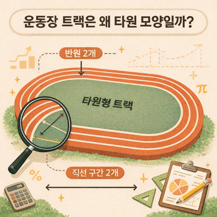 운동장에 가보면 트랙은 늘 비슷한 모양입니다. 네모도 아니고, 완벽한 원도 아닌 양쪽은 둥글고 가운데는 쭉 뻗은 모양. 이 모양은 단순히 “보기 좋아서” 만들어진 것이 아니라, 사람이 달리는 방식과 수학적 조건을 동시에 고려한 결과입니다. 1️⃣ 먼저 생각해보자: 트랙은 어떤 조건을 만족해야 할까? 운동장 트랙은 단순한 길이 아닙니다. 경기를 위해 만들어진 공간이기 때문에, 반드시 지켜야 할 조건들이 있습니다. 출발점과 도착점이 같아야 한다 누구나 같은 거리를 달려야 한다 여러 명이 동시에 달려도 불공평하지 않아야 한다 빠르게 달릴 수 있어야 하고, 부상 위험도 적어야 한다 이 조건들을 하나씩 떠올려 보면, “아무 모양....... <img src="https://blogthumb.pstatic.net/MjAyNTEyMTZfMjI1/MDAxNzY1ODc4ODA3MjY0.wwQT0FTuOGHau6m2u1zGCaSM13LN8tFf7kEd2e1TJ5Qg.24YzwCzwroesqtbHj38bFVpibaCi1aPxKmGiExC8VKcg.PNG/image.png?type=s3" />