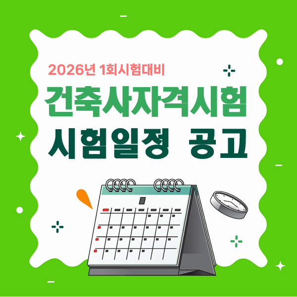 2026년도 제1회 건축사 자격시험 시행계획 공고 안녕하세요. 한솔아카데미입니다. 2026년 제1회 건축사자격시험 시험일정이 공지되었습니다. 건축사자격시험 시행일 : 2026.3.7(토) 원서접수 기간 : 2026.1.7(수)~1.14(수) 응시원서는 "건축사시험 관리 시스템" 홈페이지(http://exam.kira.or.kr)에 접속하여 접수가능합니다. 인테넷 활용이 어려우신 분들은 대한건축사협회 또는 각 시·도 건축사회에 설치된 컴퓨터를 이용하여 접수가 가능합니다. 건축사자격시험 시험일 시험일자 : 2026.3.7(토) 시험장소는 2026.2.13(금) 국토교통부, 대한건축사협회 또는 각 시·도 건축사회 홈페이지와 게시판에 공고예정입니다. 시험과목, 배점, ....... <img src="https://blogthumb.pstatic.net/MjAyNTEyMThfODkg/MDAxNzY1OTg0MjYyOTAz.xppDm4uZcUtLopwXwqmUnz32inKLzQlwM6hke1h4z1Eg.qJnTnbuk7lP7TZkSK_qoZoCfV06Zz96SRaQySbduBl4g.PNG/2026_1%C8%B8%B0%C7%C3%E0%BB%E7%BD%C3%C7%E8%C0%CF.fw.png?type=s3" />