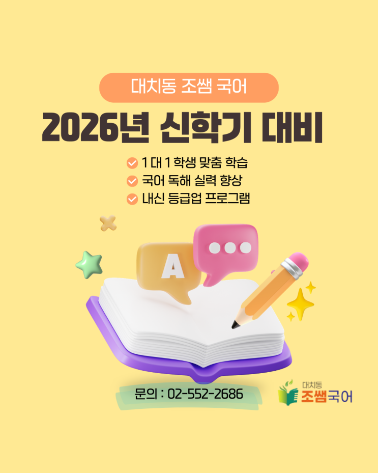 안녕하세요 대치동 조쌤국어입니다! 2026년 신학기, 학생들과 학부모님들 모두 고민이 많을 시기인데요 새로운 학년, 새로운 학교에 들어가며 바뀌는 내신 구조를 잘 모르시는 분들이 많아 대치동 조쌤국어에서 알려드리려 합니다! 신학기는 내신 성적의 방향을 설정하는 중요한 시기입니다. 새로운 학기에 접어든 만큼, 1년 학습을 계획하고 대비하는 것이 필요합니다. 그 중 국어는 독해력을 기반하여 학습하는 과목으로, 국어 실력이 다른 과목 학습에도 영향을 주기 때문에 꾸준한 학습 및 관리가 중요합니다. 때문에 조쌤국어는 소수정예로 신학기 내신 대비반을 운영하여 학생들의 국어실력 향상에 힘을 실어줍니다 저희 조쌤국어는 강남 국....... <img src="https://blogthumb.pstatic.net/MjAyNjAyMjFfMjcg/MDAxNzcxNjQ0MDAyNzEw.gOTvD9mXPNMookWqfVJecio1fHOS06g_oL9twbAfnNsg.V4FHFHQmgt31FYGFNYW4nRt4UoQ7_5kqruroolhEwHsg.PNG/%B4%EB%C4%A1%B5%BF_%C1%B6%BD%DC_%B1%B9%BE%EE_2026_%BD%C5%C7%D0%B1%E2_%B4%EB%BA%F1.png?type=s3" />