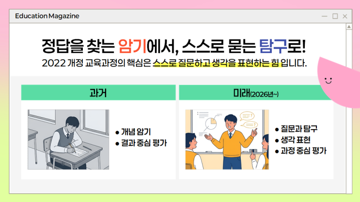 2026년부터 초등학교 5,6학년의 교육과정이 개편되었습니다. 앞으로 우리 아이들이 나아가야 할 방향에 대하여 함께 알아볼까요? 2022 교육과정은 지식을 많이 아는 것보다, 스스로 질문하고 탐구하며 자신의 생각을 표현하는 힘을 기르는 데 초점을 두고 있습니다. 특히 5~6학년은 초등 학습을 정리하며, 중등학습으로 넘어가는 중요한 시기이기에 이 시기에 탐구력과 표현력을 쌓아 중학교의 토론, 서술형 중심 수업에서 활용할 수 있어야 합니다. 국어에서는 글을 이해하고 자신의 생각을 표현하는 힘을 기르는 것에 집중합니다. 글의 주제와 글쓴이의 생각을 정확히 파악하고, 그에 대한 자신의 생각을 명확한 근거와 함께 표현할 수 있어야....... <img src="https://blogthumb.pstatic.net/MjAyNjAyMjVfNjQg/MDAxNzcxOTg2ODUyMDI0.oLloCpB4YUEx_pOivpdwWBWEJ0Qt0p1iXP97A5PIFo8g.uQV2b93xRiiPovbNYCUrZ4kTJDnVPheNqp5PXj9ehrkg.PNG/%BD%BA%C5%A9%B8%B0%BC%A6_2026-02-25_113146.png?type=s3" />
