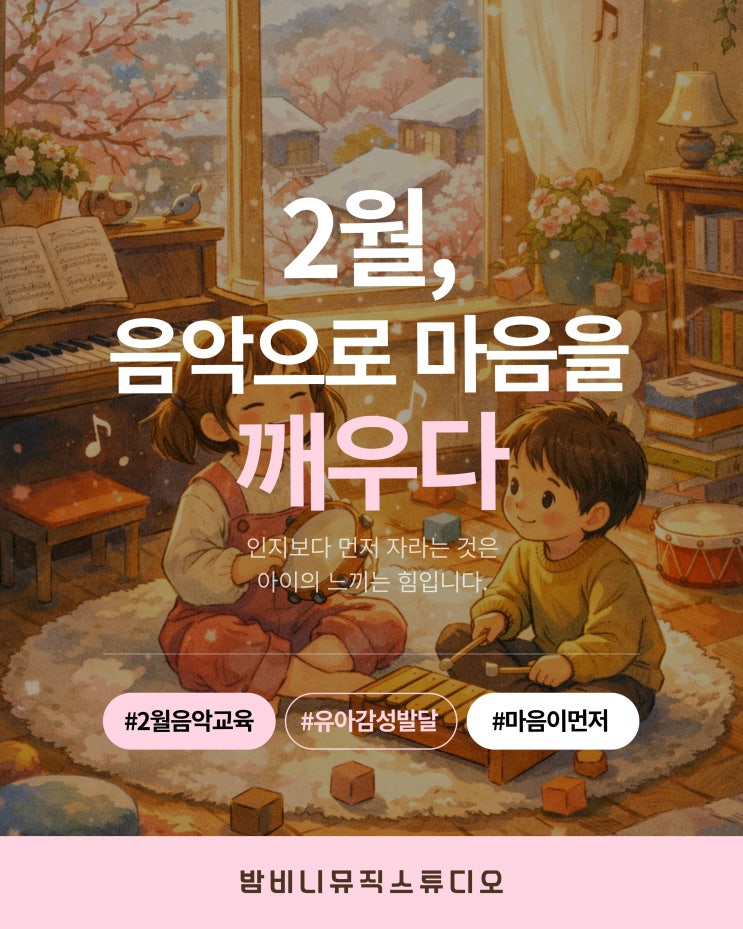 2월, 아이에게 가장 먼저 필요한 발달은 무엇일까요? 많은 부모님들이 이렇게 질문하십니다. "아직 어려서 뭘 가르쳐야 할지 모르겠어요." "공부는 언제부터 시작해야 할까요?" 하지만 유아기의 발달을 조금만 들여다보면 질문은 자연스럽게 바뀝니다. '무엇을 가르칠까'가 아니라 ✅️ '무엇이 먼저 자라야 할까'로요. 아이의 발달은 인지보다 '감성'이 먼저 움직입니다. 말을 완벽히 이해하지 못해도 아이들은 소리의 높낮이에 반응하고, 리듬에 몸을 흔들고, 분위기와 감정을 그대로 느낍니다. 이 시기의 아이에게 음악은 배워야 할 과목이 아니라 '세상을 처음 만나는 방식'입....... <img src="https://blogthumb.pstatic.net/MjAyNjAyMDJfMTM1/MDAxNzcwMDA3ODc0Mjgw.o_ijk3-oHhM0SCg_rf1vZY5TnLBU8cgyZQTKS1QS1Akg._Zoay_xU9lAnF1D8pPQi5Y-eCHmNTAl9K440Wdd2U2Qg.JPEG/KakaoTalk_20260202_123747982.jpg?type=s3" />