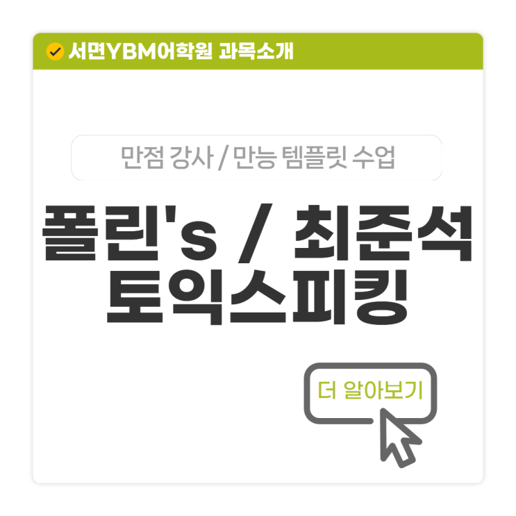 안녕하세요! YBM어학원 서면센터입니다 요즘 토익과 함께 토익스피킹 수업 문의도 정말 많은데요 ! 특히 토익스피킹은 단기간 공부해서 점수를 낼 수 있어서 선호도가 높은 과목이에요 그래서 취업, 승진 혹은 대학 졸업요건을 위해 토익과 토익스피킹을 동시에 준비하는 분들도 꾸준히 늘고 있어요 오늘은 YBM서면의 토익스피킹, 폴린'S 토익스피킹 최준석 토익스피킹 소개해드릴게요! 토익만 준비하기엔 뭔가 아쉽다면. 단기간 점수가 필요하다면, 지금 바로 토익스피킹을 시작해보세요 ✨ 폴린's 토익스피킹 폴린 강사님 커리큘럼은 한달완성반(저녁), 2주완성반 1차/2차, 그리고 발음클리닉 수업으로 구성되어 있어요 단....... <img src="https://blogthumb.pstatic.net/MjAyNjAyMjVfMTkw/MDAxNzcxOTk2OTA2MDI4.W7AhoR8YQ0OEopEDndix_ZCGGDNwkP74_QTMkBTwneQg.-BZTy4IRNJrwyfNbpqlBV4XHq_hY6hQ87nzeuUMwN0kg.PNG/%BA%ED%B7%CE%B1%D7_%B0%FA%B8%F1%BC%D2%B0%B3_%281%29.png?type=s3" />
