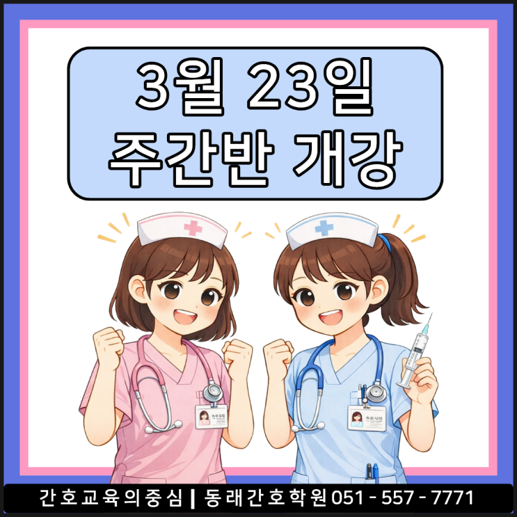 안녕하세요~ 부산 간호교육의 중심!! 동래간호학원입니다 오늘은 [3월 23일 개강하는 주간반 과정]을 안내해 드립니다 11일 개강하는 주간반 과정에도 많은 학생분들이 함께하게 되었는데요^^ 보내주신 많은 관심에 진심으로 감사드리며, 학생분들의 소중한 선택이 1년 동안 안정적으로 이어질 수 있도록 최선을 다해 교육을 진행하겠습니다 수많은 자격증 가운데 자격증 취득만으로 직업으로 이어질 수 있는 과정은 많지 않죠!! 취업과 실무 활용도 모두 높은 자격증으로 알려진 간호조무사 과정은 의료기관에서 꾸준히 필요한 인력으로 자리 잡으며 안정적인 직업을 준비하고자 하는 분들의 관심이 지속적으로 증가하고 있는 추....... <img src="https://blogthumb.pstatic.net/MjAyNjAyMDdfNTgg/MDAxNzcwNDUxNjY1Njcx.eEUTGcX2OLRZGm6DmcBtaTWHUXs0Kmingqi3mb9WypQg.DsJrSWnmiGelY__q5Lx_feOkl1ZsvhX9ZeFF7yinSikg.PNG/56546356.png?type=s3" />